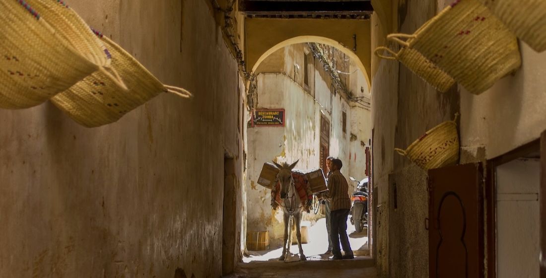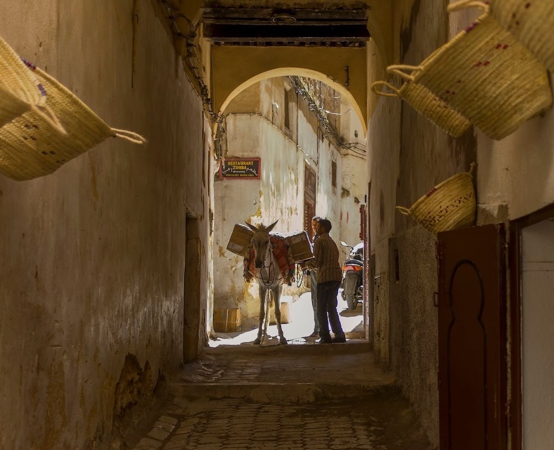 La médina de Fès se referme doucement derrière soi, comme une promesse murmurée. Les ruelles rétrécissent, respirent, vibrent au rythme des pas et des sabots. Les ânes avancent avec une sagesse tranquille, chargés de paniers débordant de peaux tannées, de provisions, de souvenirs invisibles ; les appels des muletiers résonnent comme une ponctuation ancienne, familière. Les visages se croisent, sans hâte, regards profonds, gestes simples, humanité dense et silencieuse.
